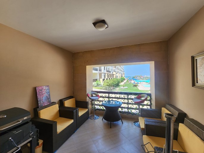 The apartment includes 2 bedrooms, 2 bathrooms, a modern kitchen, and an open living area, all finished to a high standard. It comes furnished, providing a convenient, move-in-ready option in one of the most accessible and well-located developments in Hurghada.